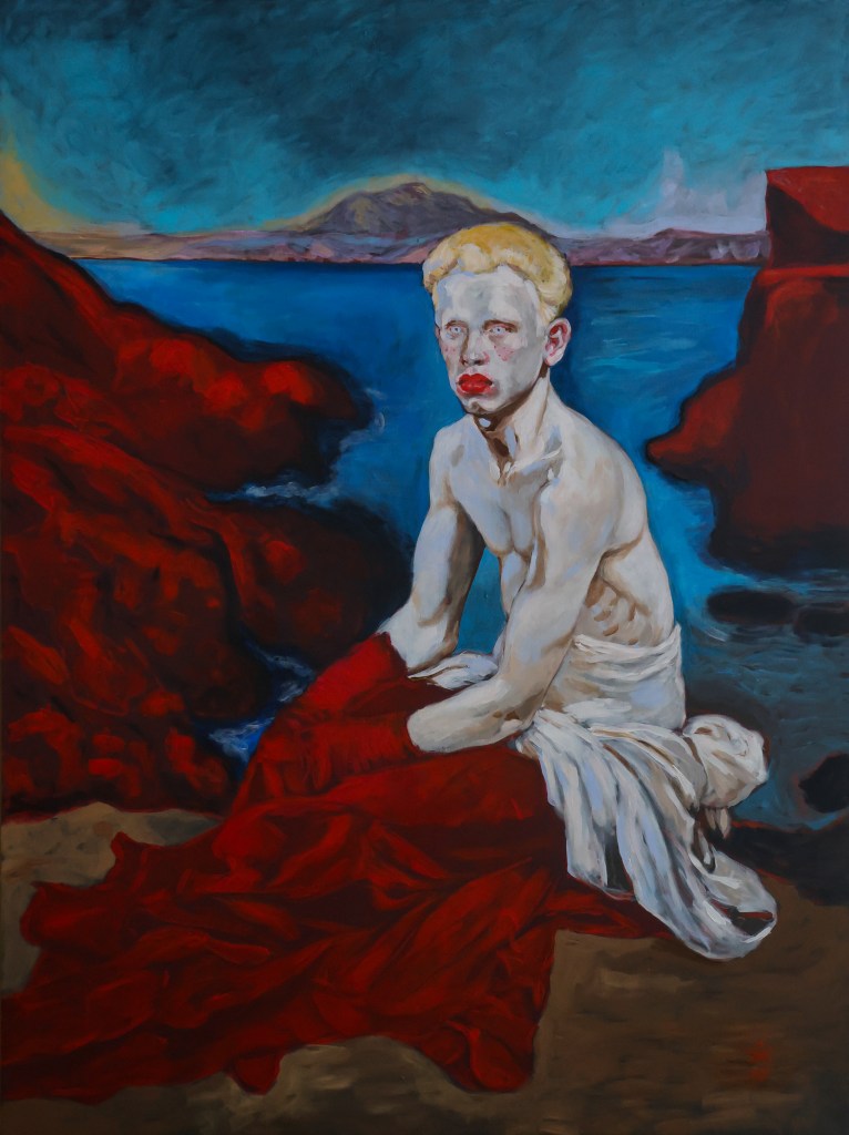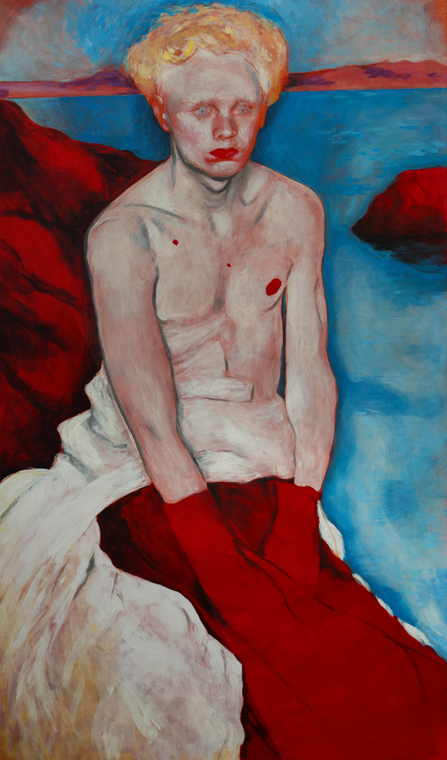 Depicted in isolation against backdrops of open landscapes and endless water surfaces, they are cast into a space without the possibility of shelter, facing the threat of objectification. Simultaneously, however, they invite the viewer into their idealized imaginary worlds, which serve as their only refuge and sense of security. These queer aspects and gender fluidity are explored through a free and fluid engagement with classical painting techniques.