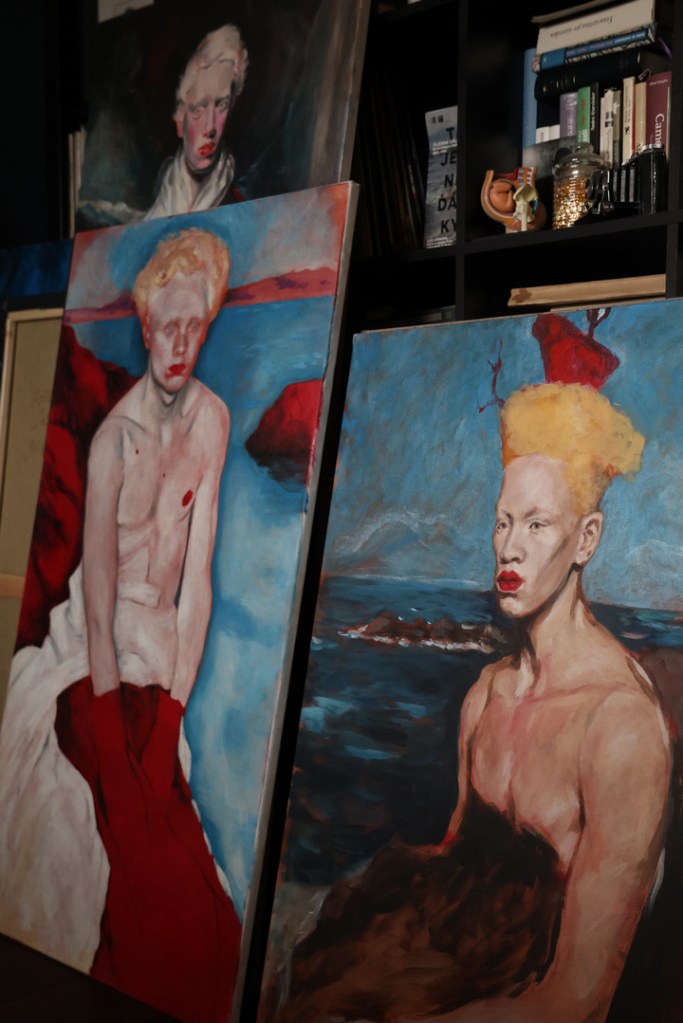 The figures, characterized by a distinct paleness that visibly distances them from common stereotypes, do not act as participants in a narrative. Instead, they appear as beings in a state of meditation or as if caught in a moment of accidental intrusion within their private space. These subjects are often androgynous with ambiguous gender identities, captured during the period of adolescence.