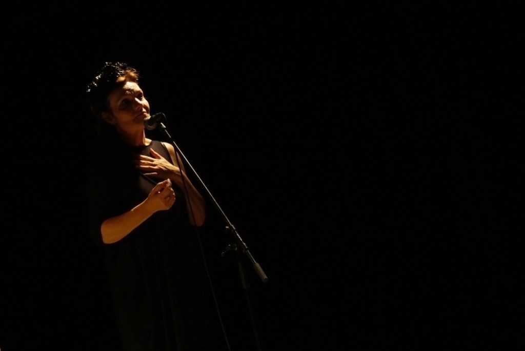 It was an impressive entree, when Jana Oľhová appeared on stage in a white gown embellished with strong red symbols (a huge drop of blood over her lap and a red cross over her chest, like a bull’s eye), a headband of red roses and black peacock feathers, slightly resembling the eccentric Queen of Hearts from Alice in Wonderland. She had the imposing aura of a monarch, but deeply withheld sadness seeped from her. Impersonating Elizabeth I of England, whose mother, Anne Boleyn was executed two years after giving birth to her, she told a childhood memory of envisioning herself being in the safety of the womb of her deceased mother out of fear from death, because her life was under constant threat. A beautiful and ambivalent metaphor: it condenses the childlike idea of death, the longing for the lost mother and for the safeness she never experienced; the urge growing even stronger than her own fear from dying.