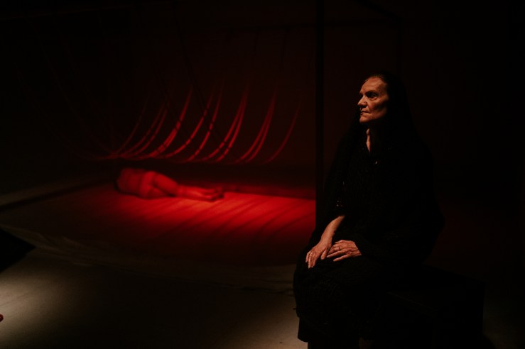 In Absentia / Mother Line is a tribute to Slovak archaeologist Martina Kušnírová, who was murdered in 2018 along with her fiancé, investigative journalist Ján Kuciak. The version expanded with movement theatre is a continuation of an earlier performance In Absentia intended for two speakers. The combination of video art, sound, recited text, and physical presence is intended as a ritual of mourning for the deceased. The title Mother Line refers in Slovak to the beekeeping practice, specifically the process of raising queen bees, which involves careful choice and mating to guarantee the continuation of desired traits.